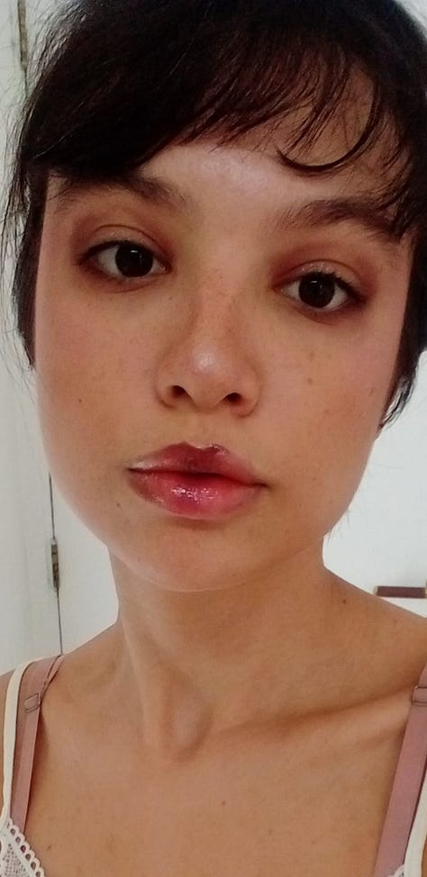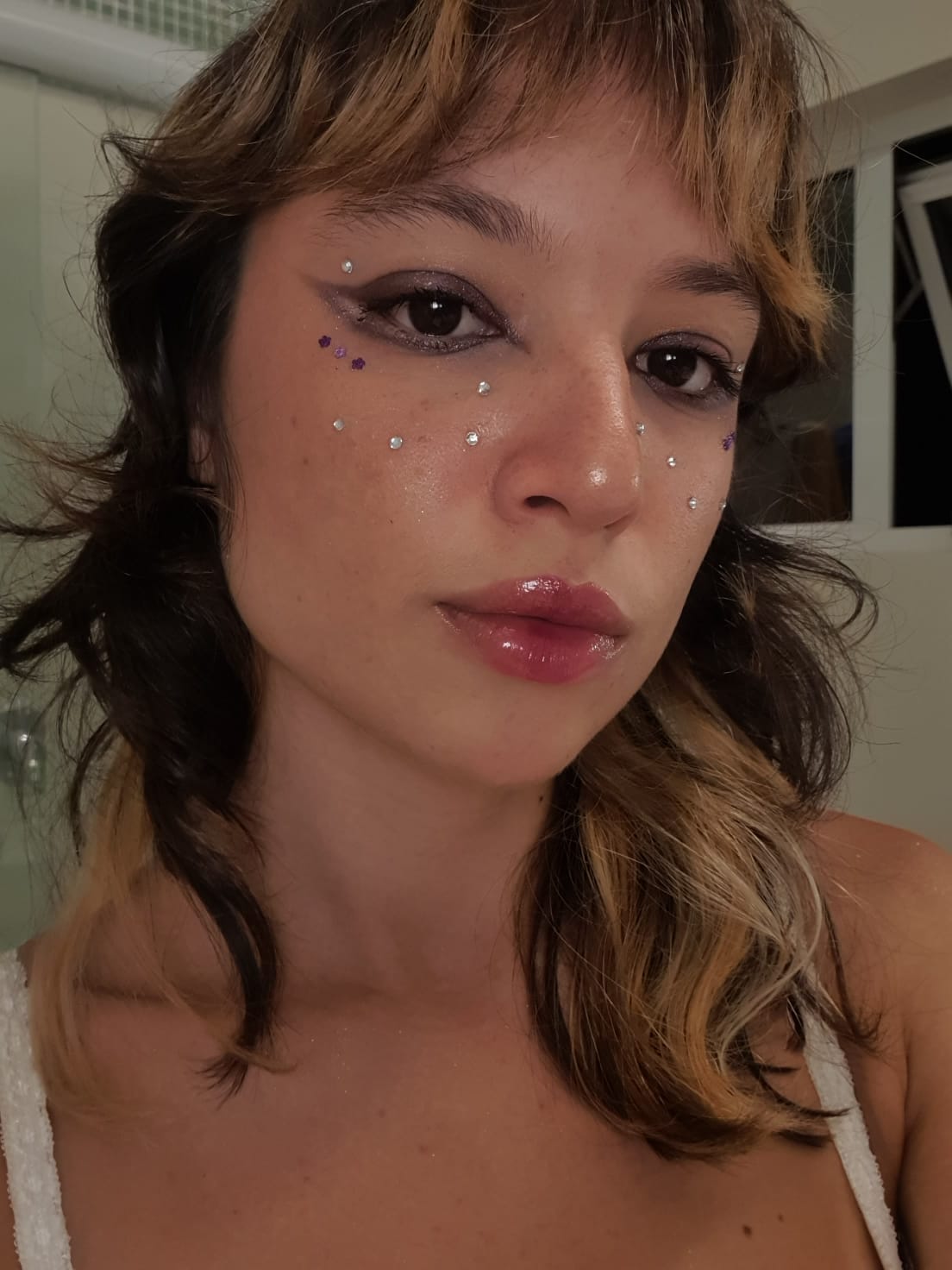 e maquiagem dela inspirada no desfile na época que ela trabalhava em um lugar que não podia usar maquiagem artística kkkk: