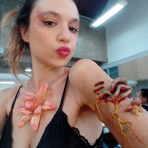clara gregori cagnoni tem 26 anos e nasceu artista. claro que isso levou para a formação em artes do corpo, ao trabalho com teatro, dança, artes visuais. mas isso é trabalho, ela sempre foi apaixonada por todo e qualquer tipo de arte - foi ela que me levou ao longo assunto das performances e me fez apaixonar por isso. é a pessoa com mais informações aleatórias e curiosas sobre tubarões e animais do mar ou de qualquer área na real. apaixonada por tudo que gosta, por maquiagem artística (obrigada clara por ser maquiadora de verdade com diploma e tudo e por ser minha maquiadora oficial) e pelo pingu.